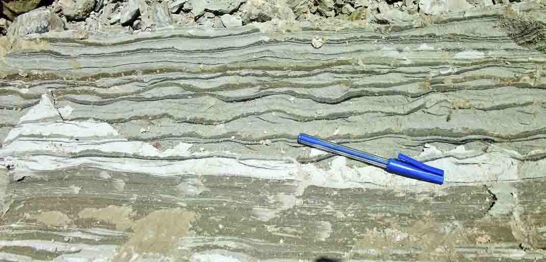 Tidal bedding in the high wall of an coal mine. Kalimantan, Indonesia. The lighter beds form as the tide flowed, and the darker layers of mud formed in the still waters of slack-tide
