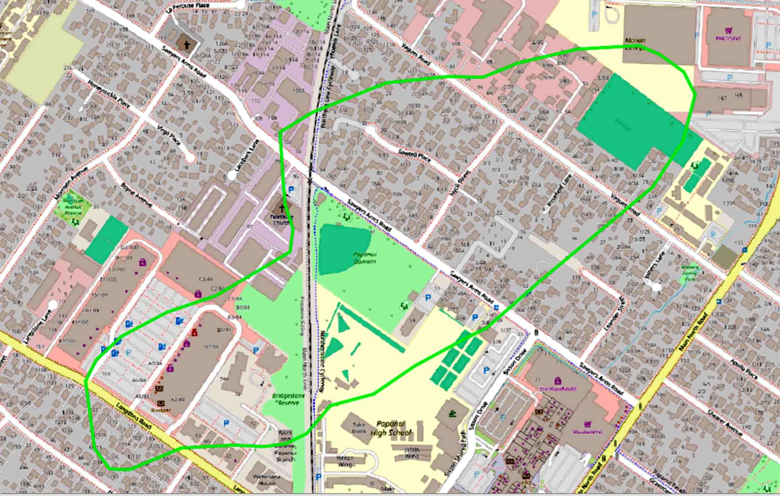 The original extent of Papanui Bush (from the Black Maps) shown over an Open Street map.